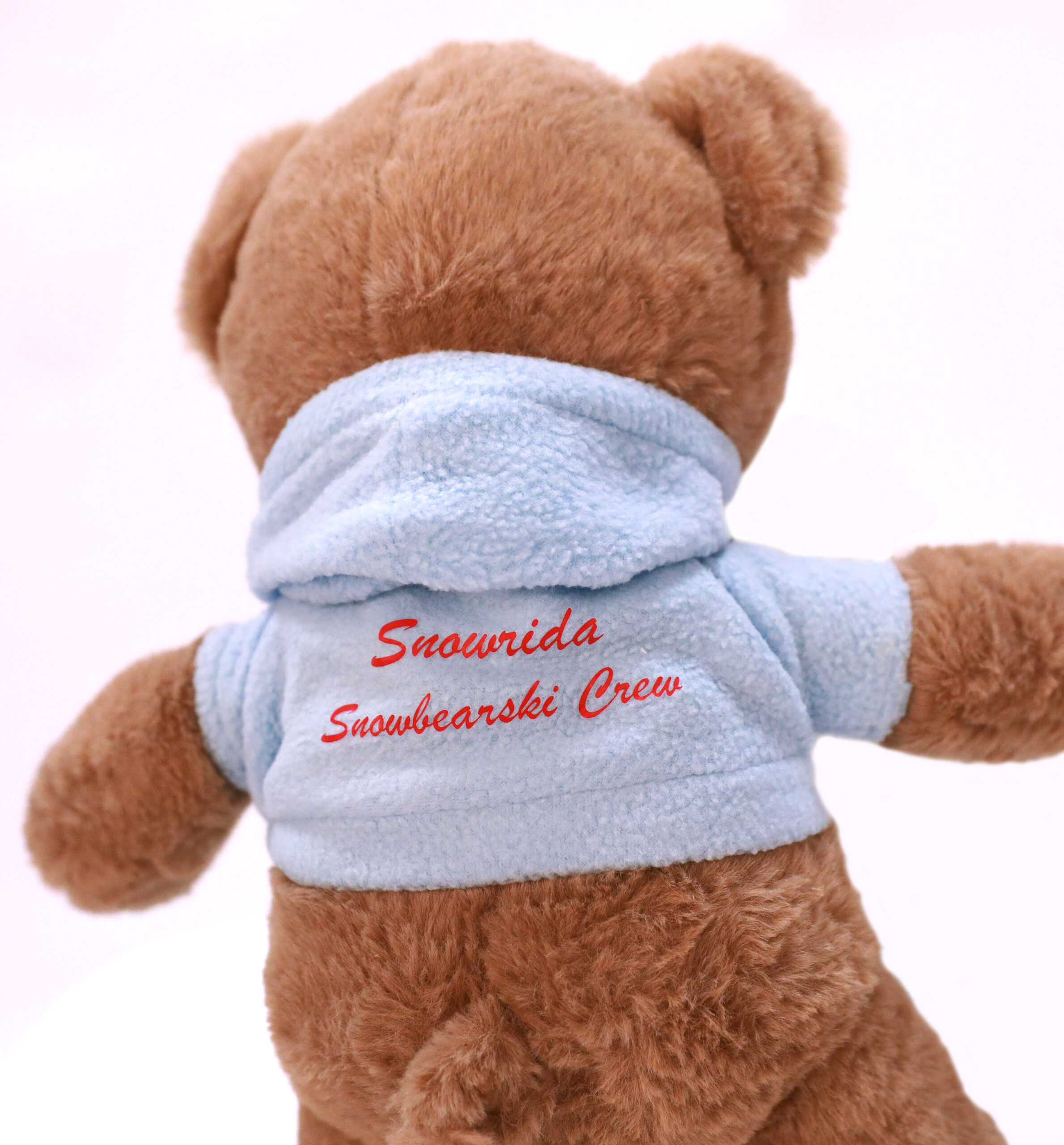 Made from snuggly brown fur and sporting a funky blue hoodie with his name on the back.